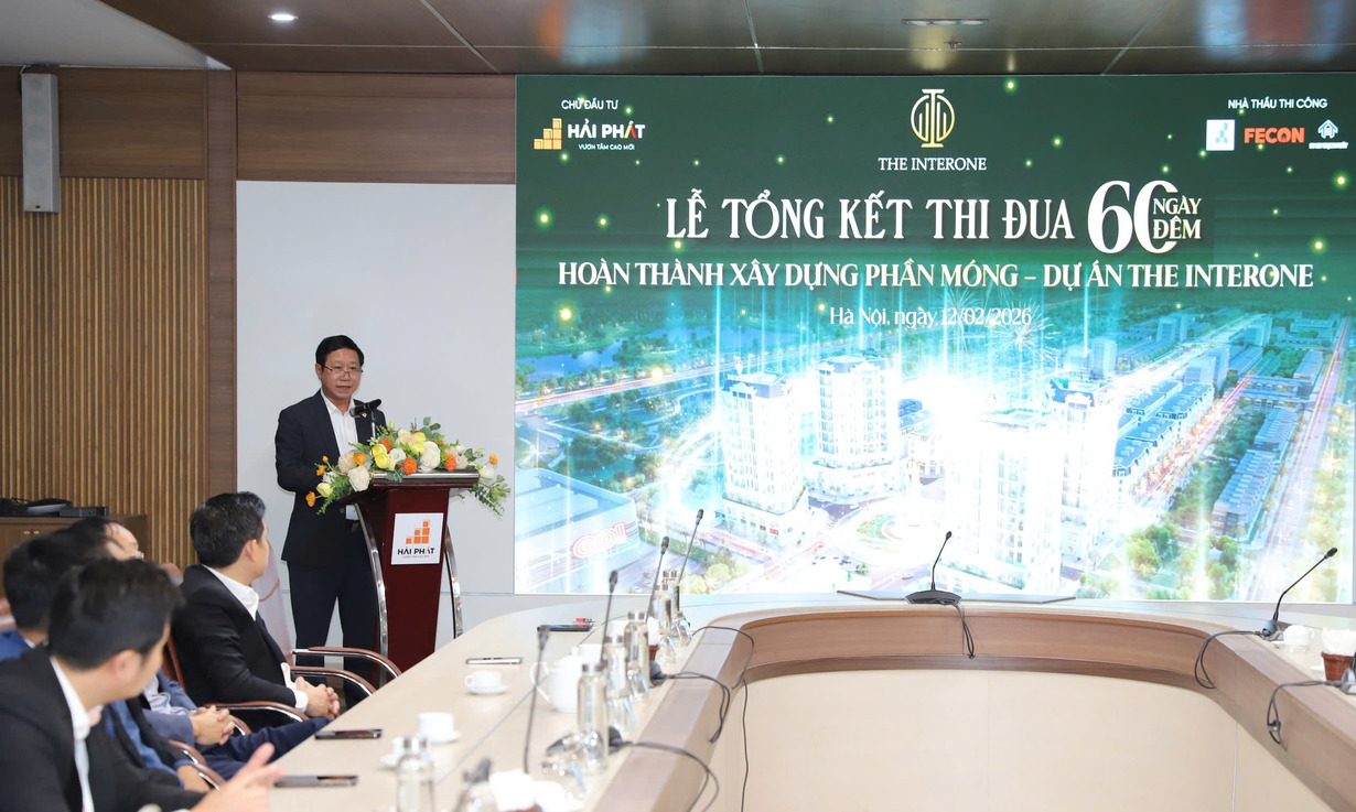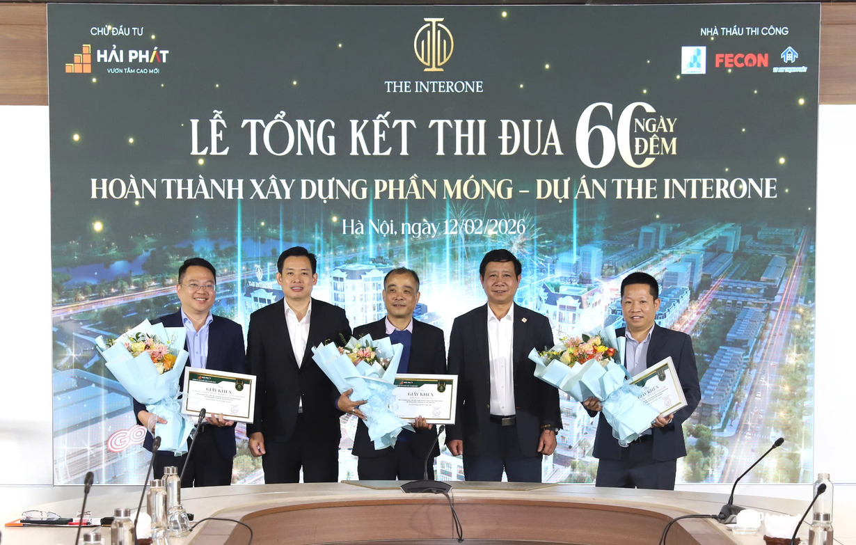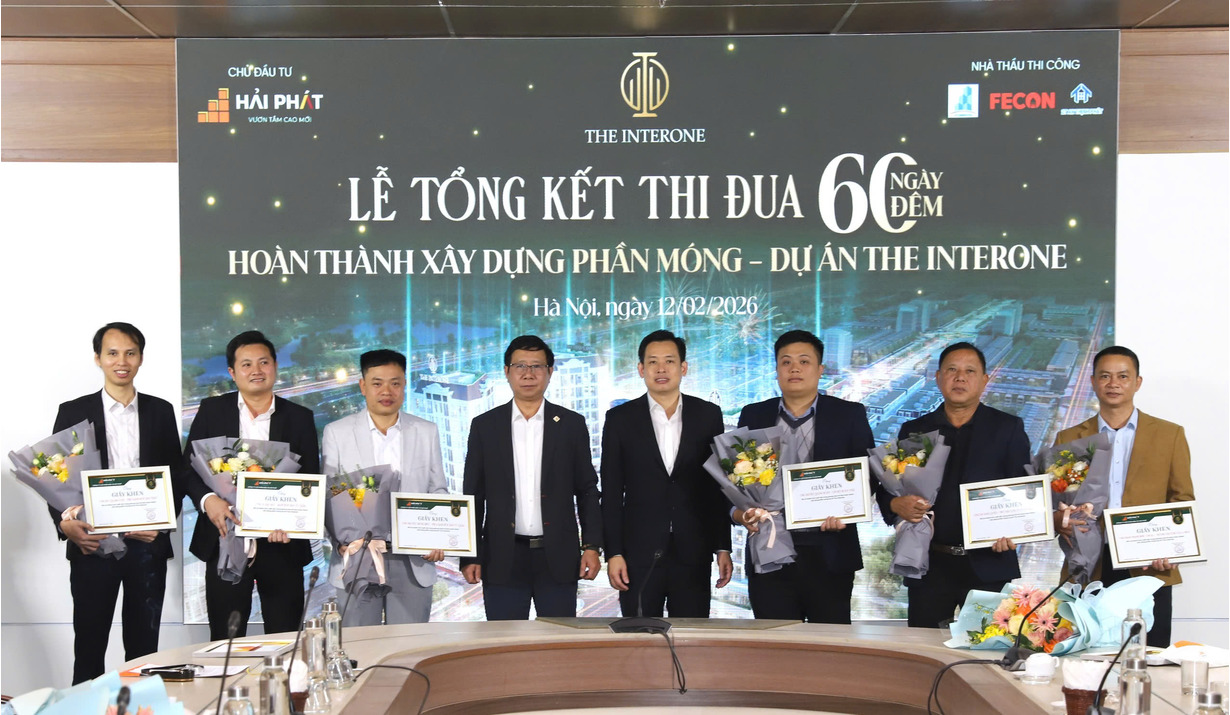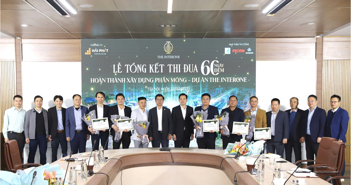 Sáng ngày 12/02/2026, Tập đoàn Hải Phát (HPX) đã tổ chức Lễ tổng kết thi đua “60 ngày đêm hoàn thành xây dựng phần móng Dự án The Interone”. Chương trình là dịp để Ban Lãnh đạo Tập đoàn cùng các đơn vị nhà thầu nhìn lại chặng đường nỗ lực cao độ, đồng thời ghi nhận và tôn vinh các tập thể, cá nhân có thành tích xuất sắc trong giai đoạn thi công quan trọng của dự án.